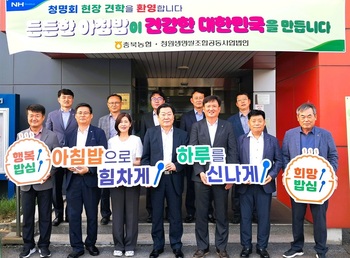 충북농협(총괄본부장 이용선)은 지난 8일 충북 주요 기관·단체장 18명과 함께 청원생명쌀조합공동사업법인(청원통합RPC)을 방문해 쌀 소비 촉진을 위한 아침밥 먹기 캠페인과 간담회를 실시했다고 9일 밝혔다.이날 참석자들은 청원통합RPC와 식품가공센터에서 위생적인 생산과정