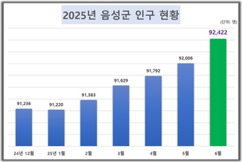 충북 음성군은 적극적인 인구정책과 대규모 주택 공급 효과로 내국인 인구가 9만2400명을 돌파하며 큰 폭의 인구 증가세를 이어 나가고 있다고 2일 밝혔다. 행정안전부 주민등록인구 통계에 따르면, 2025년 6월 30일 기준 음성군 내국인 인구수는 9만2422명