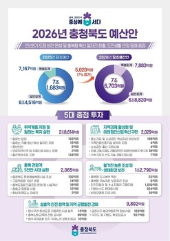 충북도가 민선8기 도정 기조인 변화·혁신 완성을 목표로 2026년도 예산안을 전년 대비 7.0% 증가한 7조6703억 원 규모로 편성했다. 재정여건이 쉽지 않은 상황에서도 취약계층 복지, 혁신 일자리, 미래 첨단산업, 관광·농촌·균형발전 분야에 전략적 재원이