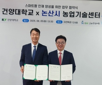 충남 논산시와 건양대학교가 손잡고 스마트농업 분야 협력에 본격 나선다.논산시농업기술센터와 건양대학교는 지난 5일 건양대 글로컬캠퍼스 스마트팜학부에서 ‘K-스마트팜 협력 프로젝트’ 위한 업무협약을 체결했다고 6일 밝혔다. 협약에 따라 두 기관은 산학연계를 통한