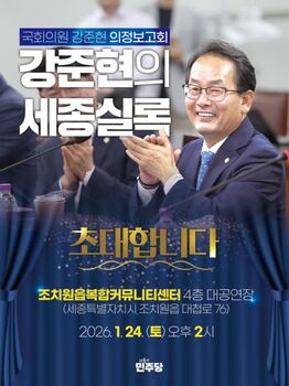 더불어민주당 강준현 국회의원(세종시을)은 오는 24일 오후 2시 조치원복합커뮤니티센터 대공연장에서 22대 국회 의정활동 성과를 보고하는 '의정보고회'를 연다고 19일 밝혔다.이번 의정보고회에서는 지난 1년간의 국회 입법 성과와 함께 행정수도 완성 과제, 세종지방법원·대