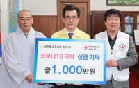 신종 코로나바이러스 감염증(코로나19) 극복을 위해 충북 불교계도 힘을 보태고 나섰다.대한불교조계종 제5교구 본사 법주사 주지 정도스님이 13일 충북도청을 방문해 코로나 19 확산 방지를 위한 성금 1000만 원을 기탁했다.정도스님은 “코로나 19 극복을 위해 밤낮으로