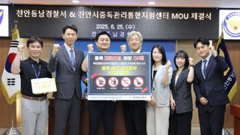 천안시중독관리통합지원센터(센터장 성준모, 이하 센터)와 천안동남경찰서(서장 송해영)가 ‘중독 ZERO, 희망 ON’ 사업장 지정을 위한 업무협약을 25일 체결했다.이번 협약은 중독 문제를 조기에 예방하고 회복 가능성을 높이는 안전한 지역사회를 조성하기 위한 목적으로 추