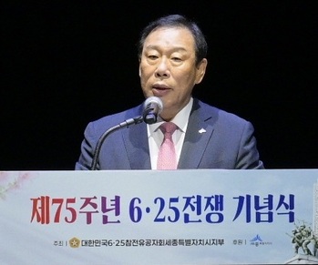 충북도는 6·25전쟁 75주년을 기념하는 행사를 25일 청주 예술의 전당에서 개최했다. 참전유공자들의 희생과 헌신을 기리고 전쟁의 역사적 교훈을 되새기기 위한 이 날 기념행사에는 김영환 충북도지사를 비롯해 이범석 청주시장 등 기관단체장과 각급 보훈단체 회원,
