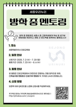 세종시교육청은 대학생 봉사 멘토단 세종우리누리가 오는 7월 23일부터 8월 6일까지 세종진로교육원에서 중고등학생을 대상으로 ‘여름방학 중 진로·진학 멘토링’을 운영한다고 25일 밝혔다.세종우리누리는 세종 지역 고교 졸업생 또는 거주 대학생들로 구성된 교육봉사단체로, 2