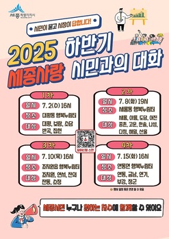 최민호 세종시장이 7월에도 ‘세종사랑 시민과의 대화’를 통해 시민과의 소통에 나선다.이번 행사는 시장과 시민이 직접 만나 시정 방향을 공유하고, 미래전략수도 세종의 비전을 함께 모색하는 자리로 마련됐다. 현장에서는 자유로운 질의응답과 의견 개진이 가능하며, 시