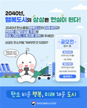 행정중심복합도시건설청(청장 김형렬)은 이달 23일부터 8월 14일까지 ‘2040 행복도시 탄소중립 도시 비전 공모전’을 연다고 20일 밝혔다.시민 참여를 통해 탄소중립 도시 조성에 대한 창의적 아이디어를 모으기 위한 취지다.공모 주제는 에너지 자립률 50% 달성을 목표