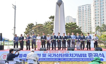 김태흠 충남지사가 9일 천안 북부스포츠센터에서 열린 ‘종축장이전개발 범천안시민 추진위원회 창설 30주년 기념식 및 국가산업단지 유치 기념탑 준공식’에 참석해 “천안이 인구 100만의 대도시로 발전할 수 있도록 성환 국가산단을 제대로 개발하겠다”고 밝혔다.이번 행사는 지