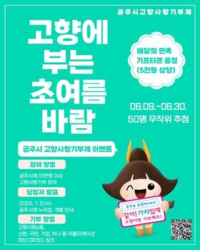 충남 공주시는 고향사랑기부제 활성화를 위해 ‘고향에 부는 초여름 바람’을 주제로 6월 한 달간 특별 이벤트를 진행한다고 9일 밝혔다.이벤트는 9일부터 30일까지 운영되며, 10만 원 이상 기부 시 자동 응모된다. 추첨을 통해 50명에게 5000원 상당의 모바일 배달 이