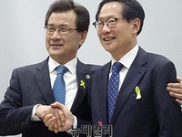 더불어민주당 6·13지방선거 충북지사 공천장을 두고 치열한 경쟁을 벌였던 이시종 지사와 오제세 의원이 손을 맞잡았다. 변재일 충북도당위원장 주관으로 열린 16일 충북지사 후보 확정에 대한 기자회견에서 이시종 충북지사와 오제세 의원은 단일대오를 구축하고 지선을 치르기로