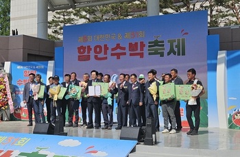 부여군 수박연구회가 전국 무대에서 다시 한번 ‘부여 수박’의 명성을 빛냈다. 28일 부여군에 따르면 지난 25일 경남 함안군에서 열린 제2회 전국수박품평회에서 부여군 수박연구회 회원들이 금상 1점, 동상 2점을 수상하는 등 값진 성과를 거두며 품질 경쟁력을 증