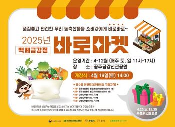 충남 공주시는 지역 농업인과 소비자를 직접 연결하는 직거래 장터 '바로마켓 백제금강점'을 오는 19일부터 운영한다고 15일 밝혔다.장터는 19일부터 11월 30일까지 매주 토·일요일 오전 11시부터 오후 5시까지 금강신관공원에서 열린다. 지역 농가가 직접 재배