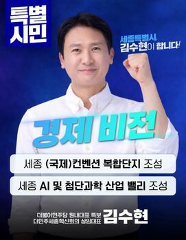 김수현 더민주세종혁신회의 상임대표(더불어민주당 원내대표 특보)는 24일 행정수도 세종의 위상에 걸맞은 경제 전략으로 ‘세종 (국제)컨벤션 복합단지’와 ‘세종 AI 및 첨단과학 산업 밸리’ 조성 구상을 발표했다.김 상임대표는 “세종시는 행정 중심 도시를 넘어 국제교류와