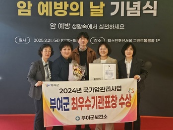 충남 부여군은 지난 21일 열린 제18회 전국 암 예방의 날 기념행사에서 보건복지부 주관 ‘2024년 국가 암 관리 사업 우수사례 공모’에서 국가 암 검진 최우수기관으로 선정 발표됐다고 밝혔다. 이번 평가는 지역암센터에서 1차 심사와 외부 평가위원으로 구성된