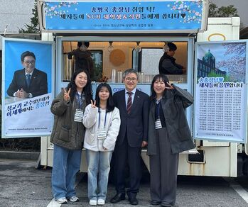 순천향대 청소년교육·상담학과 동문들이 신임 총장으로 부임한 송병국 교수를 응원하기 위해 서프라이즈 커피차 이벤트를 진행해 눈길을 끌었다. 25일 순천향대에 따르면 커피차 이벤트는 청소년교육·상담학과 김이현(07), 이수빈(08), 이보람(09) 동문