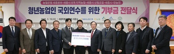 NH농협은행 세종본부와 지역농협, 세종산립조합이 세종시 청년농업인의 역량강화 지원에 발벗고 나섰다.세종시는 19일 시청에서 청년농업인 국외연수 지원을 위한 기부금 전달식을 했다고 밝혔다.이날 행사에는 최민호 시장, 홍순옥 NH농협은행 세종본부장, 8개 지역농협 조합장,