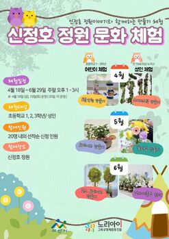 아산시가 신정호정원 관광 활성화를 위해 ‘정원문화체험 프로그램’을 시작한다.20일 시에 따르면 ‘정원문화체험’은 충남 제1호 지방정원인 신정호정원의 수목 및 초화류 등의 생태해설을 듣고 자연물을 직접 만지며 토분인형 등을 만드는 프로그램이다.프로그램 운영은 4월 18일