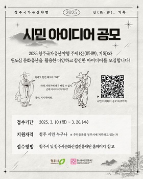 충북 청주시와 청주시문화산업진흥재단(대표이사 변광섭)이 오는 26일까지 ‘신(新·神), 기록’을 주제로 펼쳐질 ‘2025 청주 국가유산 야행 시민 아이디어 공모’를 진행한다고 10일 밝혔다.공모 분야는 △해설·체험·놀이·전시·공연 등 세 가지 이상의 분야가 결합된 복합
