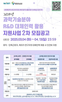(재)충북테크노파크(원장 오원근)는 한국여성과학기술인육성재단(이하 WISET)과 협약을 통해 ‘2025년 과학기술분야 R&D 대체인력 활용 지원사업’ 2차 모집공고를 오는 4월 13일까지 진행한다고 밝혔다.이 사업은 과학기술정보통신부의 여성과학기술인 육성지원 사