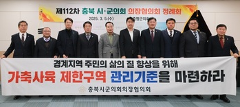 충북시군의회의장협의회(협의회장 청주시의회 의장 김현기)는 5일 제112차 정례회를 열고, 도내 시군 경계지역에서 발생하는 축산악취와 축산폐수 문제 해결을 위해 충북도 차원의 통일된 가축사육 거리 제한 기준을 마련할 것을 촉구하는 ‘시군 경계지역 가축사육 제한구역 통일기