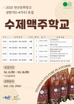충남 논산문화관광재단(이사장 백성현)은 오는 11일부터 18일까지 '2025 연산문화창고 수제맥주학교' 상반기 참가자를 모집한다고 10일 밝혔다. 이 학교는 곡물 양조와 맥주 이론을 배우는 프로그램으로, 지역 주민과 맥주 애호가들에게 특별한 경험을 제공한다.참