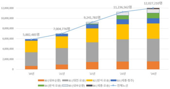 행정중심복합도시건설청은 행복도시권 간선급행버스체계(BRT) '바로타' 이용객이 지난해 1203만 명을 기록하며 2020년 대비 2배 이상 증가했다고 3일 밝혔다.현재 B0B6 등 7개 노선을 운행 중이다.지난해 이용객 비중은 B1(대전오송) 36.6%, B2(반석정부청