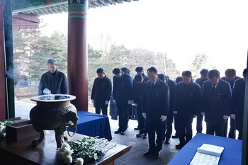 박상돈 충남 천안시장이 1일 을사년 새해를 맞아 천안인의 상과 유관순 열사 추모각 등 신년 참배를 하며 새해 업무를 시작했다. 박 시장은 이날 이순희 충남동부보훈지청장을 비롯한 보훈·안보단체장, 간부 공무원 등과 ‘천안인의 상’과 천안함 46용사 추모비, 광복