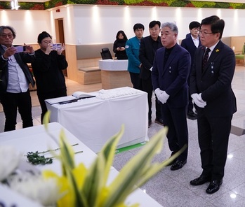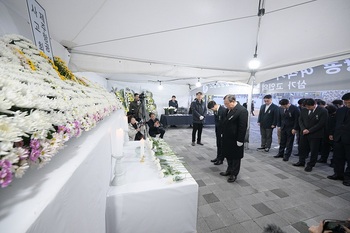 최민호 세종시장은 30일 시청 서측 광장에 마련된 ‘제주항공 여객기 사고 합동분향소’에서 참배했다. 최 시장은 김하균 세종시 행정부시장 등 시청 실·국·과장 등과 함께 참배하고, 이번 사고로 애석하게 목숨을 잃은 희생자들의 명복을 빌었다.그는 참배에 앞서 방명