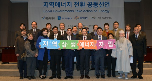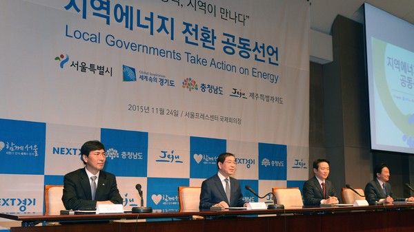 ‘에너지 정책, 지역이 만났다.’서울특별시(시장 박원순)와 경기도(도지사 남경필)‧충남도(도지사 안희정)‧제주특별자치도(도지사 원희룡)는 24일 서울 프레스센터에서 만나 ‘에너지 정책, 지역이 만나다’를 주제로 지역별 에너지정책과 사례를 공유하고 ‘지역에너지 전환을 위한 공동선언문’을 발표했다.