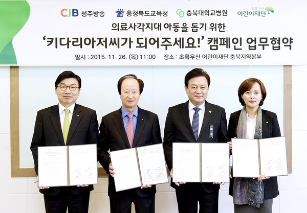 충북대학교병원(원장 조명찬)이 의료 사각지대 아동 지원에 발벗고 나섰다.충북대병원은 26일 충북도교육청, CJB청주방송, 초록우산 어린이재단 충북지역본부와 함께 ‘키다리아저씨가 되어주세요!’ 캠페인 업무협약을 체결했다.