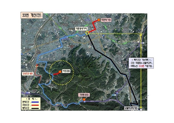 이에 대전시는 주민요청사항을 반영하기 위해 33번 노선 중 513번으로 대체가 가능한 대흥동네거리에서 낭월차고지 구간은 단축하고 대전역과 서대전농협 및 편의시설(목욕탕) 추가경유 요청하는 노선으로 조정하는 한편, 운행횟수도 당초 6회에서 7회로 1회 확대하고 운행 방법도 사정동 경유 4회, 구완동과 무수동 주민이 요청한 산성초교 경유 3회로 나누어 운행하도록 주민과 합의를 마쳤다.