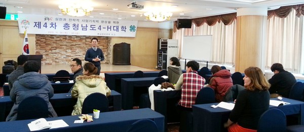 충남농업기술원은 26,27일 이틀간 아산 켄싱턴리조트도고에서 미래 농업을 이끌 인재양성을 위한 ‘제4차 충남도4-H대학’을 성황리에 마쳤다고 밝혔다.이번 4-H대학은 도내 4-H회원 및 관계자 50여 명이 모인 가운데 전략기획 분석을 통한 농가의 내·외부 환경을 분석하고 농가경영 및 사업계획을 수립하는 데 주안점을 두고 진행됐다.
