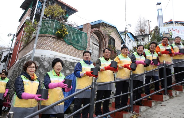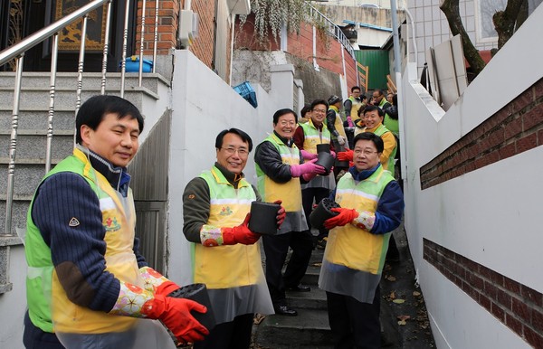 권선택 대전시장과 5개구 구청장이 140여명의 대전시 자치행정국 공무원과 함께 28일 오전 동구 대동지역에서‘사랑의 연탄나누기’ 봉사활동으로 추운 겨울 문턱에서 따뜻한 온기를 나눴다.