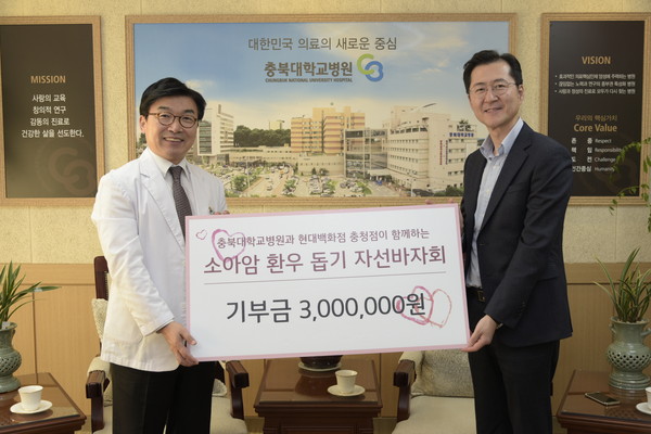 현대백화점 고남선 충청점장은 1일 충북대학교병원을 찾아 조명찬 원장에게 소아암 환우 돕기 바자회 수익금 일부를 기탁했다.
