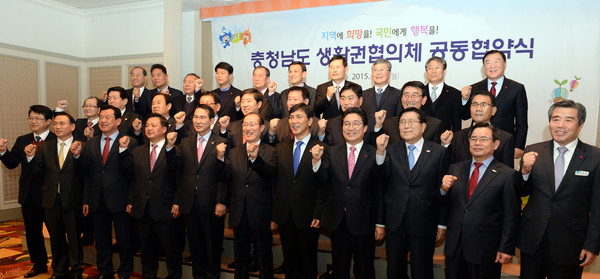 안희정 지사는 7일 아산 온양그랜드호텔에서 이원종 지역위 위원장, 15개 시·군 시장·군수와 ‘충청남도 생활권협의체 공동협약’을 체결했다.