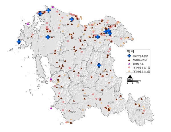지난해 기준으로 충남은 천안, 서산, 아산, 당진, 공주, 태안 등 6개 시·군에서 국가 운영 2곳과 지자체 운영 8곳 등 모두 10곳의 대기오염측정망을 설치·운영하고 있다.
