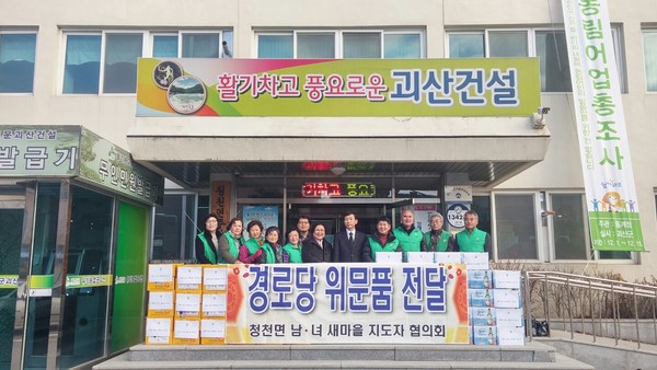 괴산군 청천면 남·여 새마을지도자 협의회는 연말연시를 맞아 18일 이웃 어르신들을 위해 55개소 경로당에 귤과 소주 등을 전달했다.