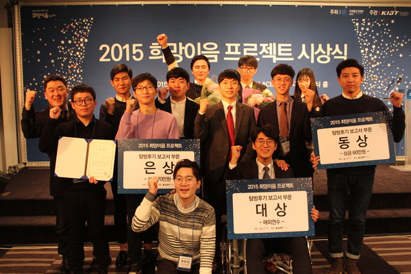 충북테크노파크(원장 남창현·이하 충북TP)는 지난 21일 열린 ‘2015 희망이음 프로젝트 시상식’에서 전국 330여개 기업탐방후기 중 지역 예선과 중앙 본선을 거쳐 최종 전국 1위로 선정돼 ‘대상’을 수상했다고 밝혔다.