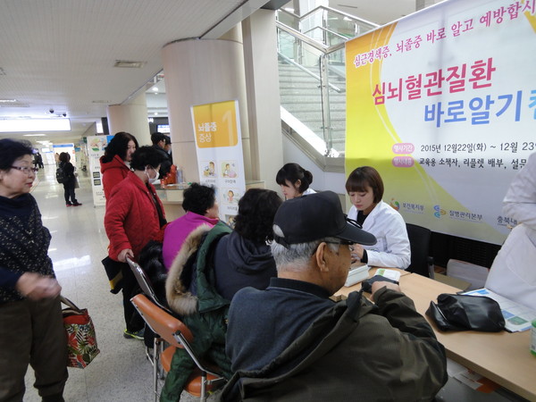 충북대학교병원(원장 조명찬) 권역심뇌혈관질환센터(센터장 황경국)는 22,23일 이틀간 병원 1층 외래에서 심뇌혈관질환 환자 및 가족, 지역주민들을 대상으로 심뇌혈관질환바로알기 캠페인을 벌였다.