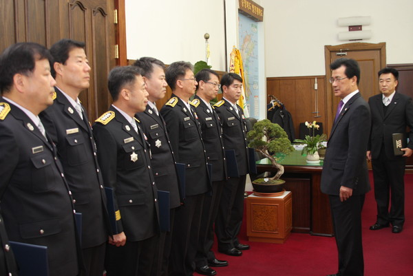 충북도 소방본부(본부장 김충식)는 29일 도지사실에서 2016년 1월 1일자 구조구급과 신설에 따른 직제개편 등 소방령 이상 22명에 대한 승진 및 전보 인사를 단행하고 승진자 7명에 임용장을 수여했다.이시종 지사는 이 자리에서 화재, 구조, 구급 등 소방현장 활동의 중요성을 강조하고 충북 도민의 안전을 위해 최선의 노력을 다 해 줄 것을 주문했다.