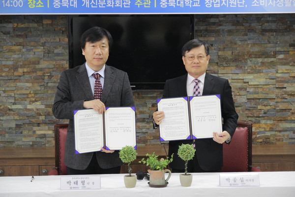 충북대학교(총장 윤여표)는 6일 개신문화관에서 박태영 창업지원단장과 박종섭 생활협동조합 이사장 등 관계자 20여명과 학생 창업기업 대표 등 30여명이 참석한 가운데 ‘청년 창업기업 우수제품 발굴 및 판로지원’을 위한 협약식을 갖고 마케팅 확대 발판을 마련한다.