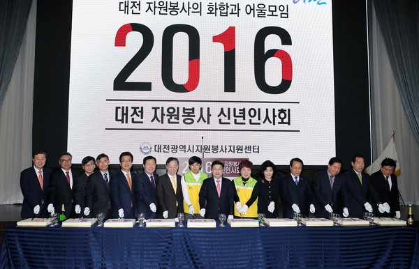 대전광역시는 7일 오전 유성 컨벤션 웨딩에서 권선택 시장과 국회의원, 구청장, 자원봉사 관계자 등 250여명이 참석한 가운데 자원봉사 신년 인사회를 갖고 자원봉사자들은 ‘행복한 대전을 만들기’ 위한 힘찬 출발을 했다.신년인사회는 대전시 자원봉사 활동의 새로운 힘찬 도약과 시민 화합을 도모하고, 자원봉사를 통해 배려와 나눔 실천을 다짐하는 뜻 깊은 자리였다.