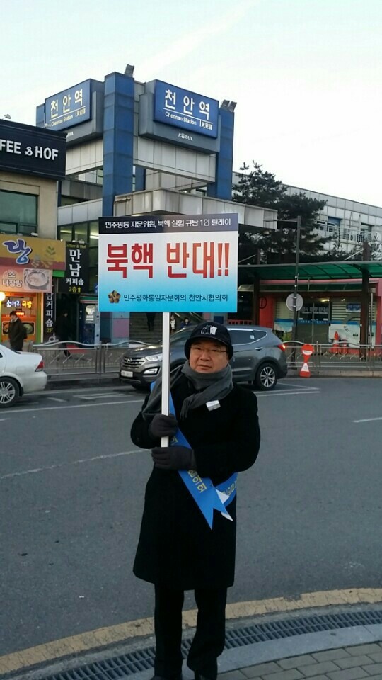 민주평화통일자문회의 천안시협의회(회장 유병수)는 ‘우리는 핵무기 없는 통일을 원합니다’라는 주제로 12일 오전 7시부터 오후 7시까지 12시간 동안, 천안역과 신부동 신세계 백화점 일대에서 북한의 핵 실험을 규탄하는 자문위원 1인 피켓 릴레이를 실시했다.