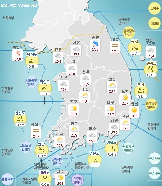 오늘(24일) 날씨도 찜통더위가 계속된다.최근 우리나라로 따뜻한 남서풍이 유입되면서 일사에 의해 낮 기온이 오른 가운데, 밤 사이에 구름많은 날씨를 보이면서 복사 냉각이 약해져 경상도를 제외한 전국 대부분 지역에서 열대야가 나타났다.현재 서울을 비롯한 내륙 곳곳에는 폭염특보가 내려졌으며, 오늘 낮 동안에도 서울과 대전·대구·광주 33도, 전북 완주가 35도까지 오르는 등 폭염이 기승을 부리겠다.현재 서울과 경기 북부, 강원 북부에는 산발적으로 비가 내리는 곳이 있으며, 오전까지 오락가락 이어질 것으로 보인다. 남부지방은 대체로 구름만 많겠다.오후에는 대기가 불안정해지면서 내륙을 중심으로 돌풍과 벼락을 동반한 소나기가 예상된다. 물결은 전 해상에서 최고 2m로 비교적 잔잔하게 일겠다.이번 주 무더위 속에 소나기가 자주 내리며, 주 중반에는 중부지방에 다시 장맛비가 내릴 것으로 전망된다.