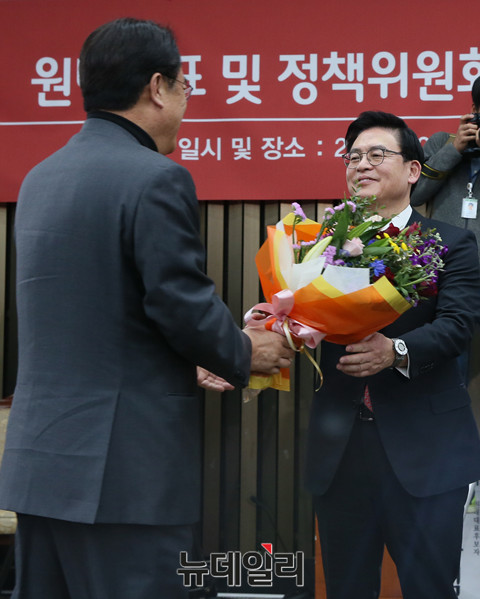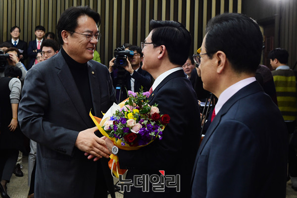 새누리당 원내대표로 선출된 정우택 의원이 16일 국회에서 열린 의원총회에서 정진석 원내대표로 부터 꽃다발을 받고 있다.