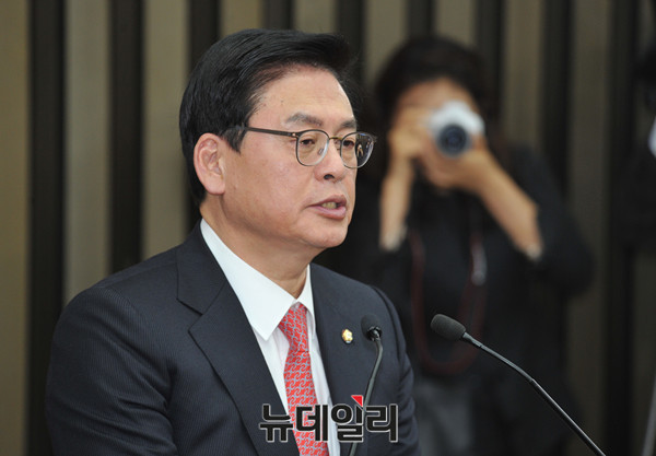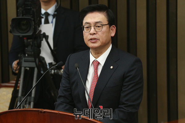 새누리당 원내대표로 선출된 정우택 의원이 16일 오전 국회에서 열린 의원총회에서 당선소감을 밝히고 있다.