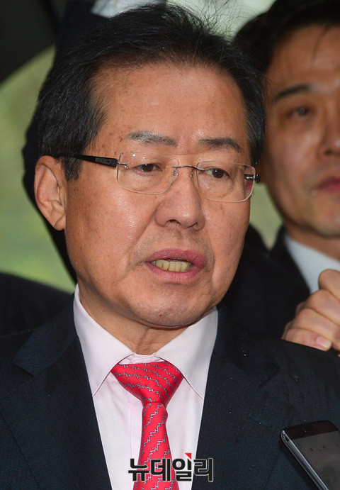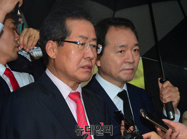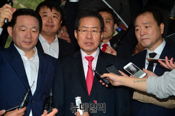 홍준표 자유한국당 대선후보가 17일 오전 충남 아산에 위치한 현충사를 참배를 마친 후 질문에 답하고 있다. 이날 홍 후보는 "백척간두의 위기에 처한 나라를 구한 충무공의 정신을 본받아 자유대한민국을 좌파의 손아귀에서 구해내겠다"며 방명록에 '死生決斷(사생결단)'이라고 휘호했다. (충남 아산=뉴데일리 공준표 기자)