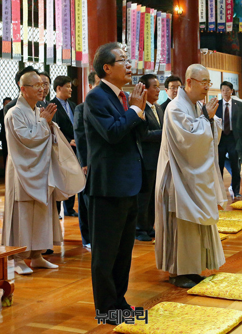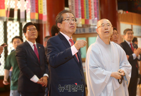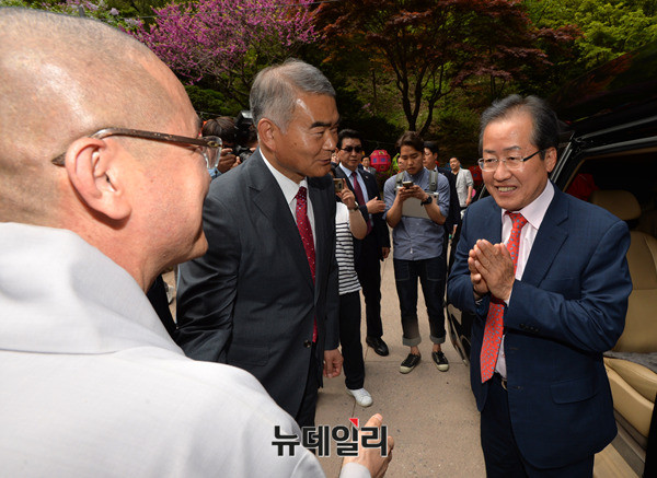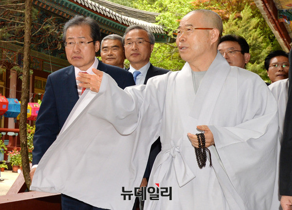 홍준표 자유한국당 대선후보가 4일 오후 충북 단양군 천태종 구인사를 방문해 총무원장 춘광스님과 인사를 나누고 있다. 홍 후보는 이날 오후 충북 제천과 충주, 강원 동해를 방문해 표심을 공략할 예정이다. (충북 단양=뉴데일리 정상윤 기자, 사진=공동취재단)
