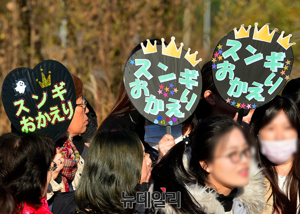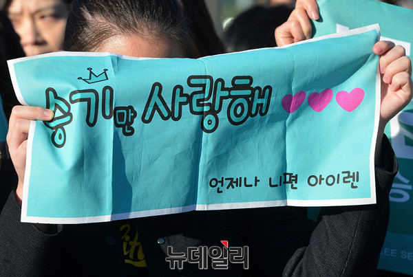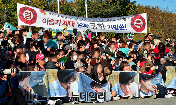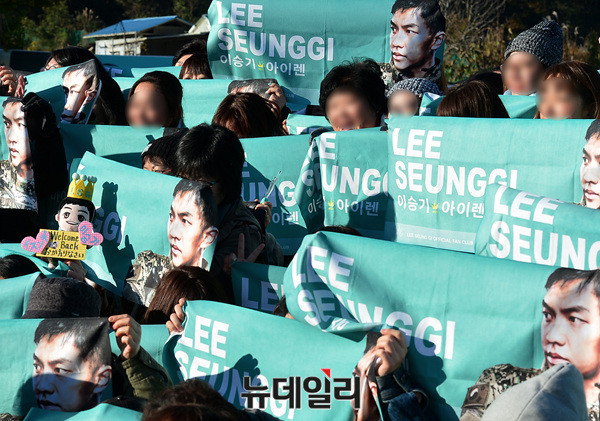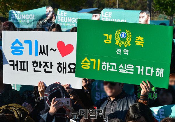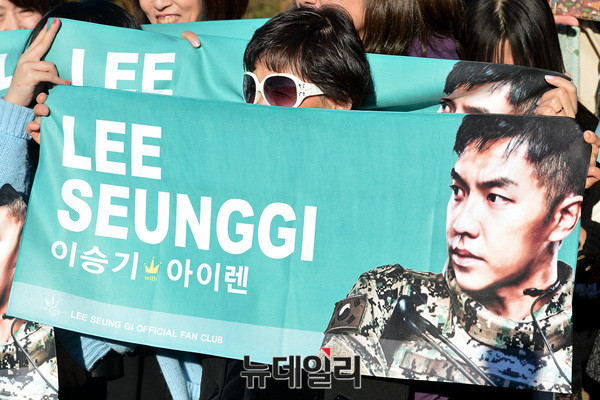 가수 이승기 팬들이 31일 오전 충북 증평군 987부대 75대대 위병소 앞에서 열린 전역식에서 이승기를 기다리고 있다.