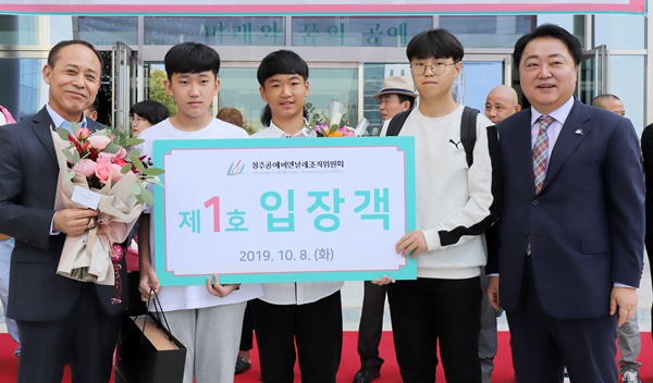 충북 청주시와 ‘2019 청주공예비엔날레’ 조직위원회(조직위원장 한범덕)가 8일 청원구 내덕동 문화제조창 C 매표소 앞에서 개장식과 함께 본격적인 관람객 맞이에 들어간 가운데 1호 관람객으로 이봉식 청주남중 교장과 학생들이 입장했다.